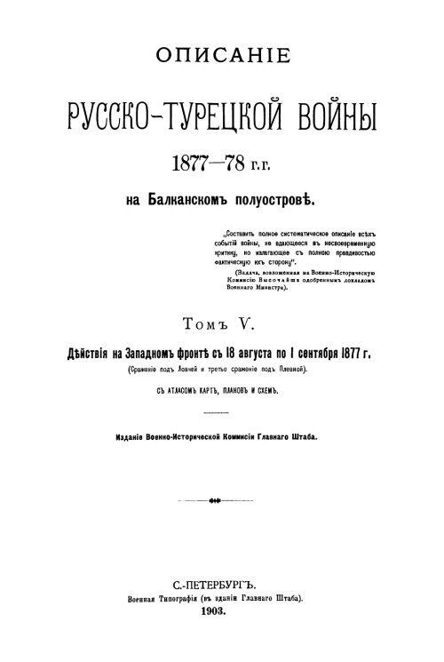 Издание Описание Русско-Турецкой войны 1877-78 годов на Балканском полуострове. Том 5. Действия на Западном фронте с 18 августа по 1 сентября 1877 года (сражение под ловчей и третье сражение под Плевной) Вы можете заказать у нас. Мы предлагаем изготовление под заказ репринтных книг, отчетов, докладов, журналов, газет, донесений, указов, плакатов, грамот, открыток и других листовых документов различных тематических категорий и жанров на русском и иностранном языках, издаваемых в 17, 18, 19, начале 20 века.