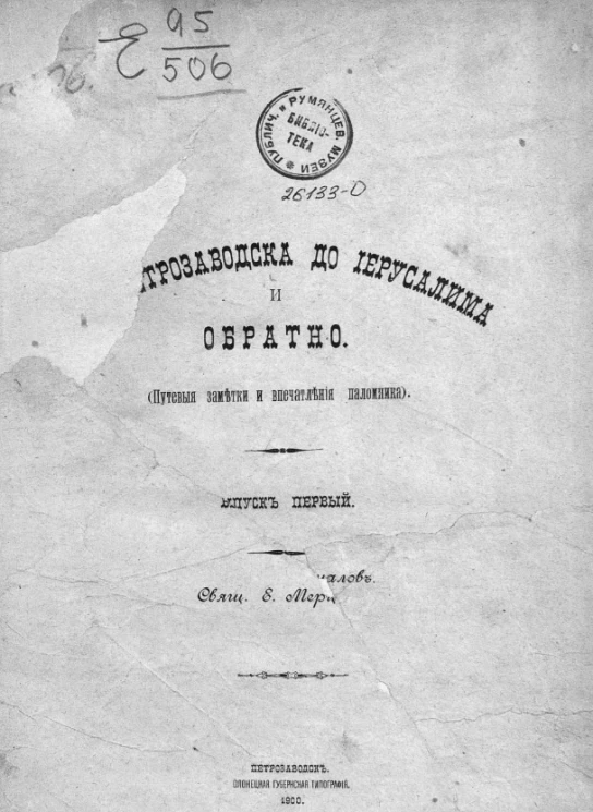 Издание От Петрозаводска до Иерусалима и обратно (путевые заметки и впечатления паломника). Выпуск 1 Вы можете заказать у нас. Мы предлагаем изготовление под заказ репринтных книг, отчетов, докладов, журналов, газет, донесений, указов, плакатов, грамот, открыток и других листовых документов различных тематических категорий и жанров на русском и иностранном языках, издаваемых в 17, 18, 19, начале 20 века.