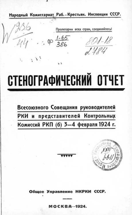 0 отзывов к товару Стенографический отчет Всесоюзного совещания руководителей РКИ и представителей контрольных комиссий РКП(б) 3-4 февраля 1924 года