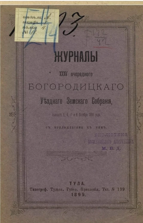 Журналы 35-го очередного Богородицкого уездного земского собрания, бывшего 5, 6, 7 и 8 октября 1899 года с приложениями к ним